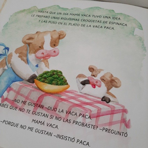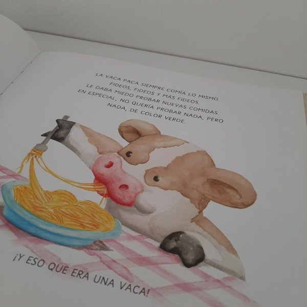 La vaca Paca no se anima a probar nuevas comidas. Solo quiere comer fideos. Pero Mamá Vaca y el resto de los amigos