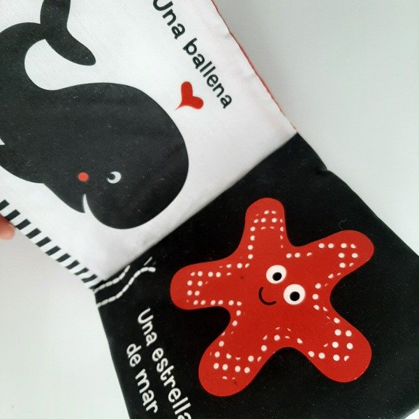 Cucú; qué ves? El mar. Un libro de tela con páginas que hacen ruido al agarrarlas; una textura suave en cubierta y tres colores contrastados; el negro; el blanco y el rojo; que atraerán la atención de los más pequeños y les ayudarán a iniciar su aprendizaje sensorial.