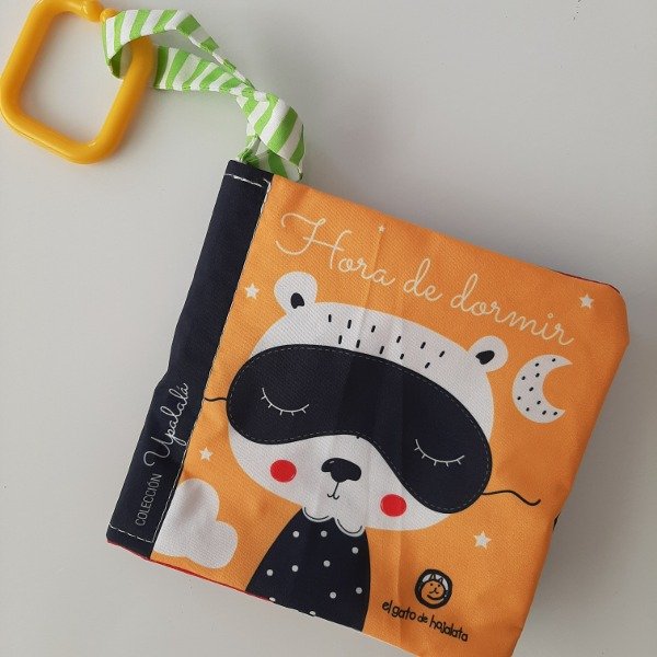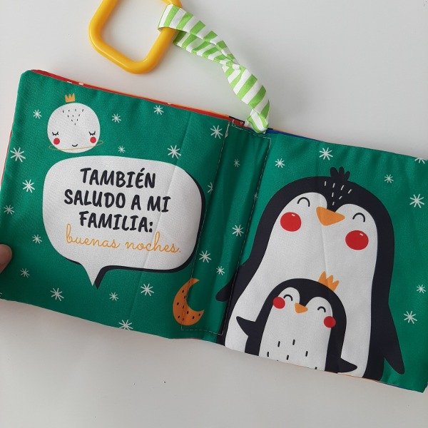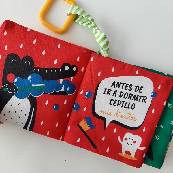 Un libro de tela suave y acolchada con relleno ruidoso y con colores vibrantes que llaman la atención de los más pequeños. Ilustraciones simples y textos cortos para que se diviertan jugando. Incluye una pulsera – gancho.