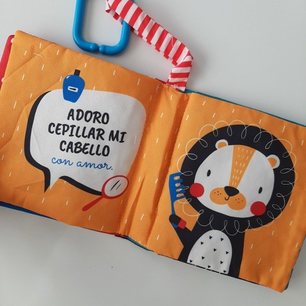 Un libro de tela suave y acolchada con relleno ruidoso y con colores vibrantes que llaman la atención de los más pequeños. Ilustraciones simples y textos cortos para que se diviertan jugando. Incluye una pulsera – gancho.